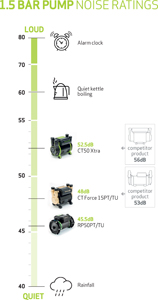 Salamander’s RP50PT, CT Force 15PT and CT 50 Xtra pumps are all rated some of the quietest in the 1.5bar class; and the RP75PT and the CT 75 Xtra are rated some of the quietest in the 2bar class.